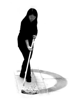 With a mop the cement floor of the desolate atrium at JCCAC is transformed into a canvas.